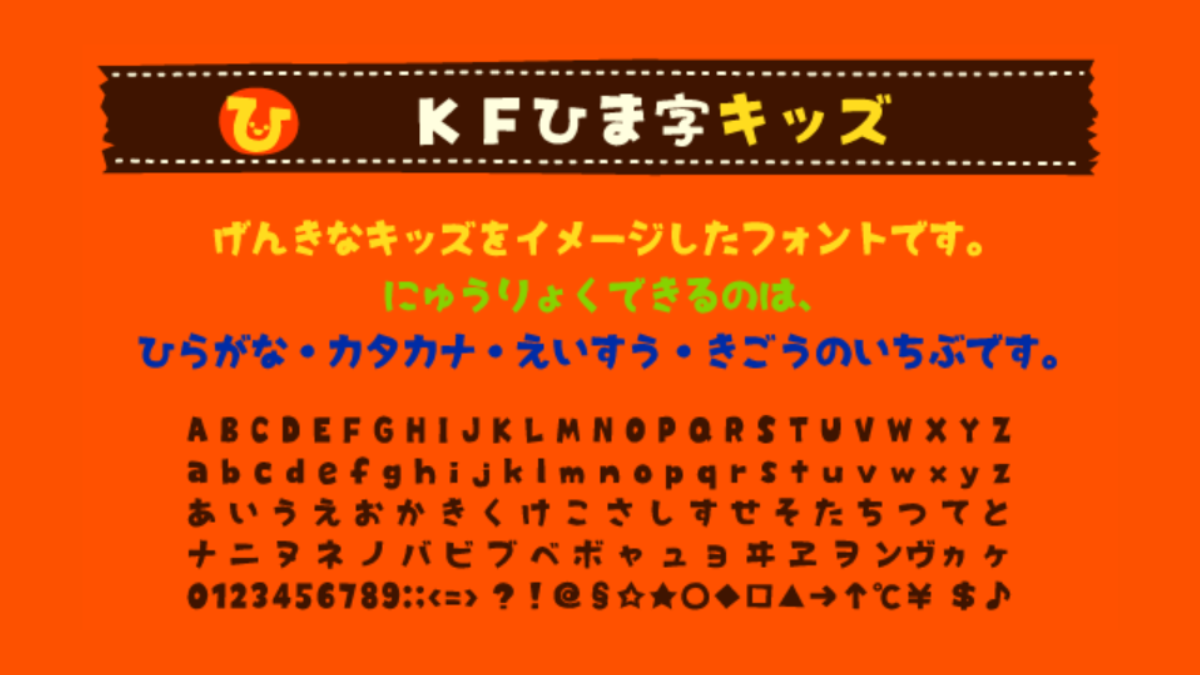 KFひま字キッズは、げんきな子供たちをイメージして作られたかわいらしい日本語フリーフォントです。太めの文字なので見出しやタイトルに向いているフォントです。