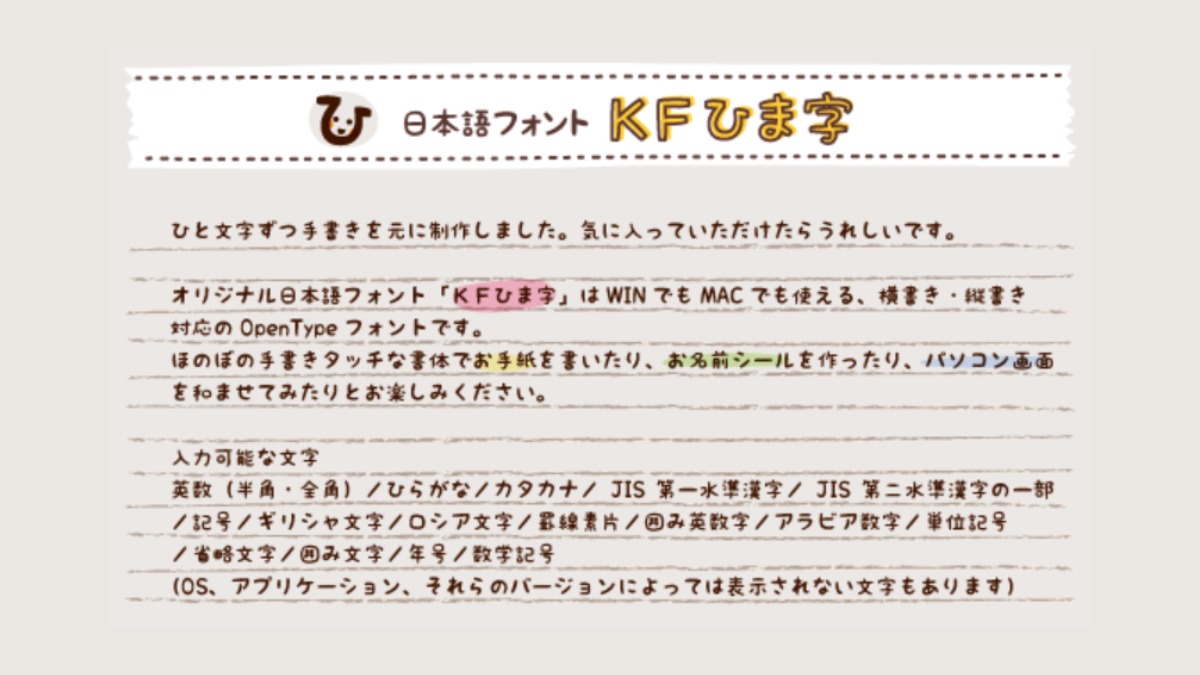 KFひま字は、ほのぼのした手書きタッチな書体のかわいらしい日本語フリーフォントです。横書き・縦書きに対応しています。