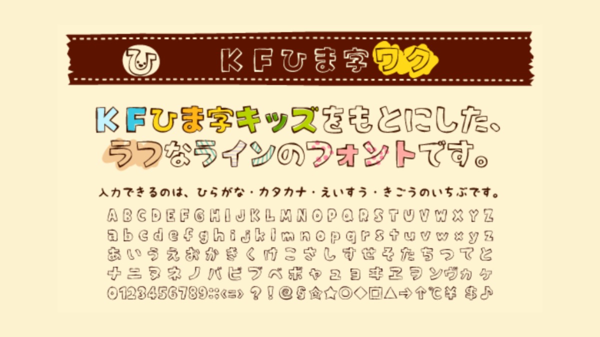 KFひま字ワクは、KFひま字キッズを元にした、ラフなラインの白抜きがかわいらしい日本語フリーフォントです。